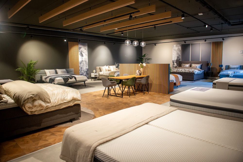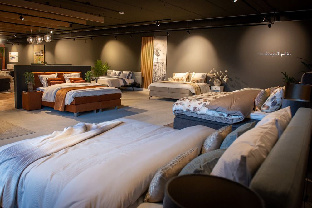 Onze opdracht omvatte het aanbrengen van glasvezel en renovliesbehang met bijpassende gekleurde muurverven, al het schilderwerk van kozijnen en plafondkoven, en het airless spuiten van het betonnen plafond in de showroom.