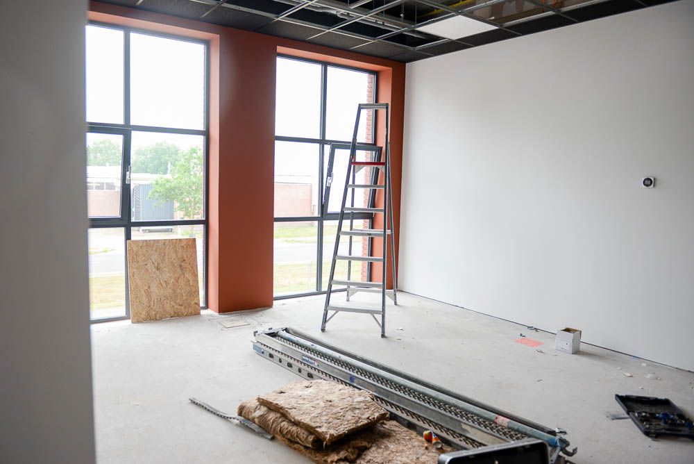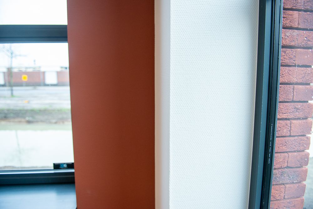 De grootste uitdaging lag bij de enorme wand van 6 bij 25 meter in de entree. Deze eyecatcher moest perfect gestuukt en voorzien worden van renovlies en verf. Onze uitstekende stukadoors van de Alde Stjelp hebben deze wand perfect voorbereid voor de verdere afwerking door ons.